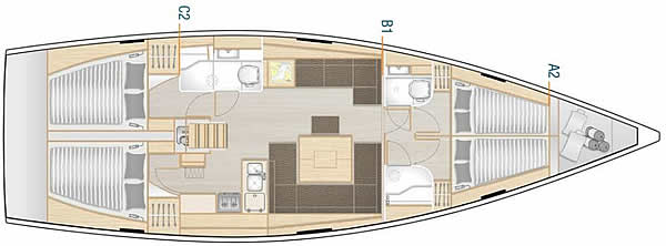 | Water capacity: 450 lt | Diesel capacity: 210 lt | Sail area: 100.50 m2 |